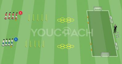 Percorso coordinativo-motorio con tiro finale di precisione e situazione di 1 contro 1Tattica