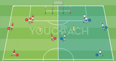 Catene di passaggi a 4 giocatori con triangolazioni e situazione finale di 1 contro 1 con tiro di precisione o conduzione pallaTecnica