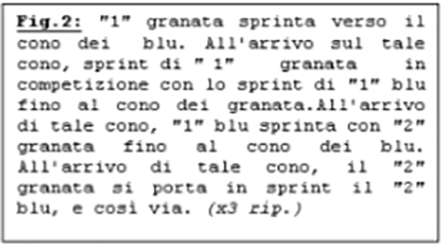 - "1" granata e "1" blu sprintano fino al cono intermedio, e sprintano tornando verso il proprio cono. Così pure gli opposti "2" e "3" *(l'unico "4" blu da solo svolge il lavoro descritto). (x3 rip.)