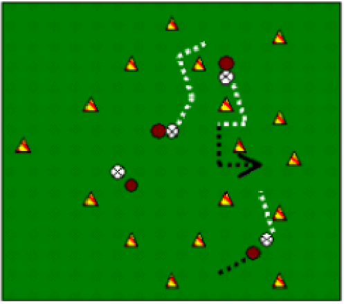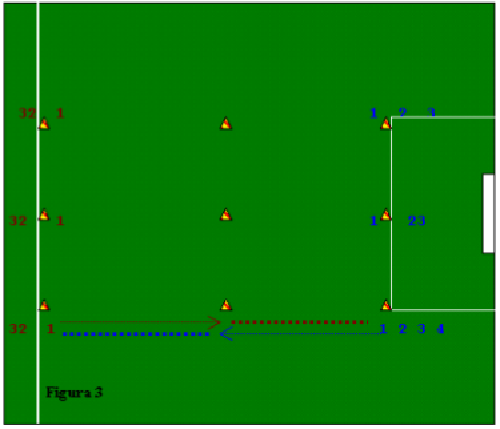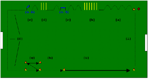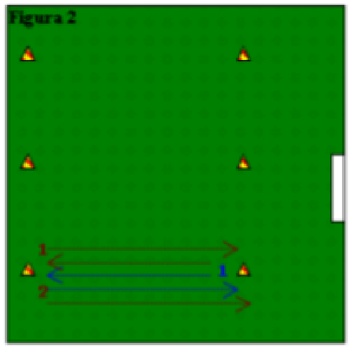 - "1" granata e "1" blu sprintano fino al cono intermedio, poi proseguono con corsa lenta fino al cono opposto. Quindi tocca ai "2" opposti, 3 e così via... *(l'unico "4" blu da solo svolge il lavoro descritto). (x4 rip.)