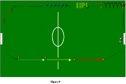 Fig.9: Rispetto al blocco precedente, una punta dei "gialli" passa ai "blu", mentre un difensore centrale dei "blu", passa ai "gialli". La squadra blu attacca, la squadra gialla deve difendersi. Il gioco si interrompe, e riprende nuovamente dai blu o quando qualora essi: abbiano concluso un'azione offensiva, abbiano subito la riconquista della palla sul pressing dei gialli. A tocco libero.