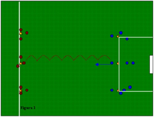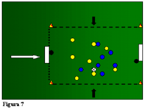 Fig.10:Si ritorna alle disposizione in campo del I° blocco: La squadra gialla attacca, la squadra blu deve difendersie ricercare ripartenze veloci. A tocco libero.