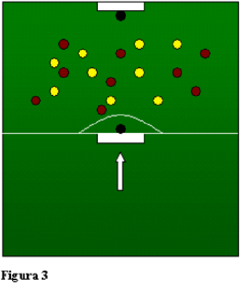 Fig.3: In una metà campo (con porta regolamentare trasportabile) si gioca un9>9 (rossi – gialli) a pallamano. La conclusione a rete, di piede, deve essere necessariamente preceduta da una “sponda” di testa.