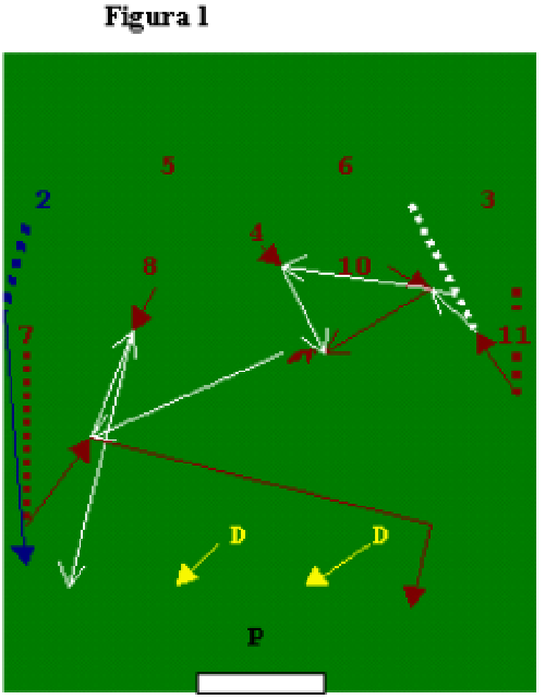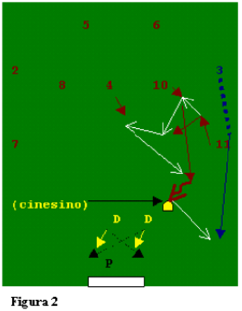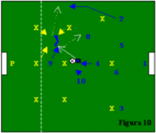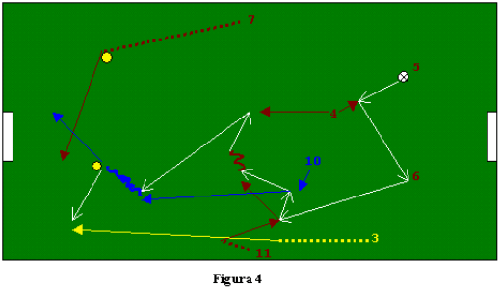 Fig.4: Il 4 va in appoggio al difensore centrale, e scarica sull’altro centrale (6); l’ala (11) effettua un movimento d’incontro, mentre il suo curosre (10) si prepara ad andare a sostegno; dopo lo scarico sulcursore, l’ala taglia a ricevere e cede palla a 4. Questi vede lo smarcamento in verticale di 10, che portando palla verso l’area e la porta avversarie, apre sulla sovrapposizione del laterale sinistro (3). Ala opposta (7) e 10 incorciano in area per la conlusione a rete.
