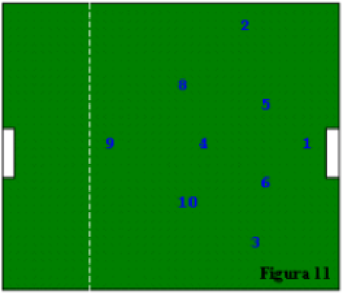 Fig.17: 11 gialli (squadra titolare) > 11 blu; entrambe le squadre disposte secondo un modulo 4-3-3.