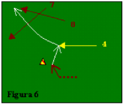 Fig.6: Ulteriore variante al tema offensivo proposto. Quando 3 converge, può anche scaricare sul sostegno di 4 che lancia sul movimento del cursore dx (8). Nella pratica, ciò si verifica ed è utile specialmente nel caso che non ci siano più i “tempi” idonei per verticalizzare vantaggiosamente sui tagli delle punte.