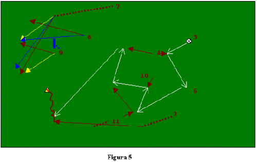 Fig.5: Analogamente alle dinamiche descritte e illustrate nella fig.1, l’11 sul taglio interno a ricevere palla cede palla sul sostegno di 4, che indirizza sulla sovrapposizione del laterale sinistro (3); questi converge con la palla, e sceglie la soluzione offensiva più idonea. Le varianti di attacco degli spazi tra 7, 9 e 8 sono le seguenti: