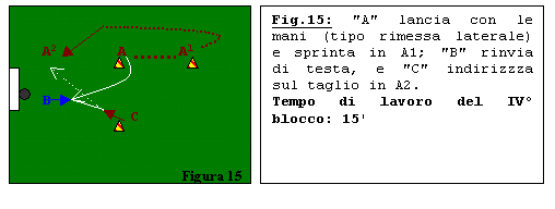 Fig.14: "A" lancia con le mani (tipo rimessa laterale), "B" deve stoppare col petto e concludere a rete.