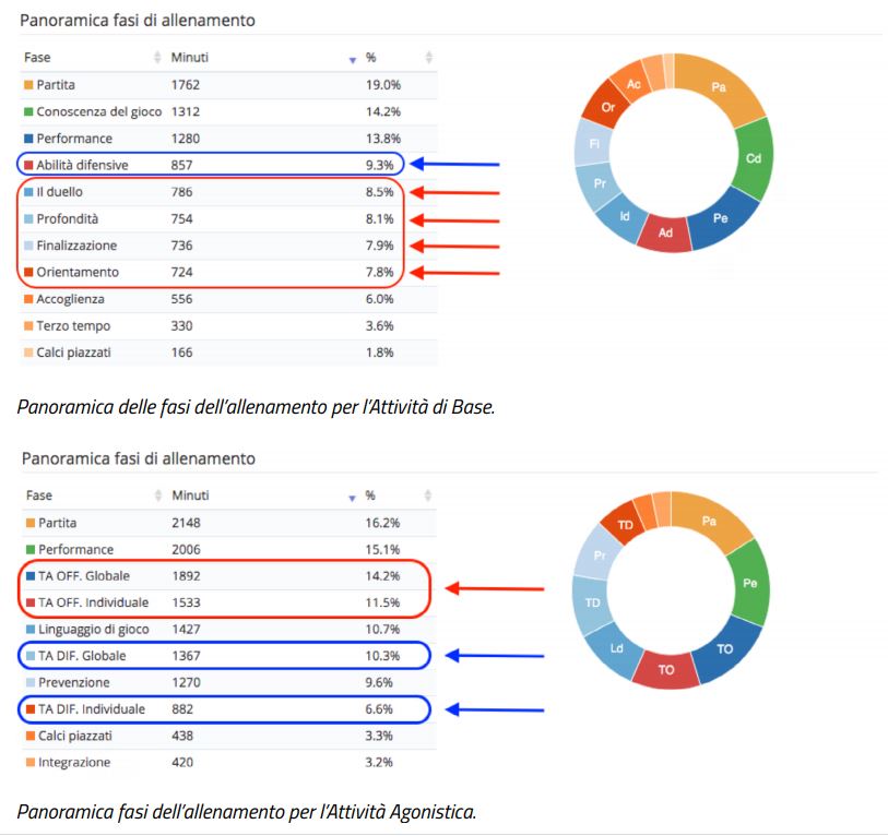 Per quanto riguarda la fase dedicata alla partita, in tutte le categorie sono alternate nel corso della settimana sia partite a tema/partite condizionate che partita libera; nell’attività di base però, il volume di minuti dedicato a quest’ultima è pressoché doppio rispetto alle partite condizionate e questo rapporto si inverte invece nelle categorie della fascia agonistica.