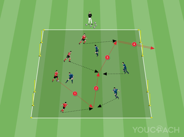Esercitazione del settore giovanile del Manchester United FC, questo 4 vs 4 Small-sided Game (SSG) aiuta i giocatori a piazzarsi correttamente nel campo di gioco e a creare opportunità da gol. Che sia usato come forma di riscaldamento o come parte di una sessione tattica, l’idea del gioco rimane la stessa, permettere ai giocatori di trovare la propria soluzione ai problemi che accadono durante una partita. L’allenatore dovrebbe evitare di dare indicazioni precise ai giocatori sul cosa fare e come e lasciare loro obiettivi di più alto livello per cominciare. Potrebbero ad esempio essere introdotte linee guida sul numero minimo e massimo di passaggi da eseguire prima della conclusione a rete, conduzione della palla solo con il piede sinistro o destro, passaggio solo con il piede sinistro e tiro con il piede destro ecc.