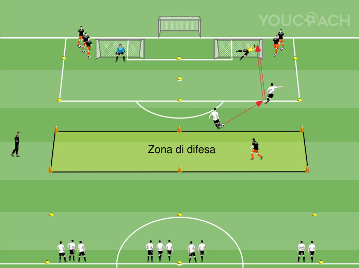 In metà campo disporre i cinesini per delimitare l'area di gioco (come in figura). Posizionare due porte sul limite dell'area piccola, a metà tra il dischetto del rigore e il limite laterale del campo. I due campi di gioco sono divisi a metà considerando la metà dell'area di rigore. A circa 3 metri dal limite dell'area formare una fascia di 5 metri che costituirà la linea entro la quale agiranno i difensori (zona di difesa). Dividere i giocatori in tre gruppi di sei giocatori. I difensori (neri in figura) partono dietro le porte con il pallone e si dispongono tre per campo. Gli attaccanti cooperano a coppie e partono da metà campo senza palla. In ogni campo si gioca un 2 contro 1. I portieri difendono le porte.