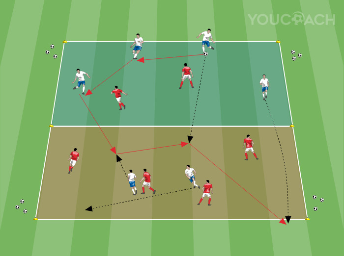 Creare con i cinesini un campo di gioco a forma di rettangolo di larghezza 30 metri per profondità 24 metri. Dividere l'area di gioco a metà, con una linea centrale orizzontale di cinesini, creando due fasce orizzontali di profondità 12 metri. Avremo così il campo diviso in due zone di ugual misura di larghezza 30 metri per profondità 12 metri. Dividere i giocatori in due squadre da sei componenti ciascuna (squadra rossa contro bianca in figura). I giocatori si sistemano con una disposizione iniziale di 4 + 2 (come in figura), ovvero quattro giocatori nella propria metà campo ed i rimanenti due nella metà campo opposta. In entrambe le metà campo si crea così una situazione iniziale di 4 contro 2 a favore di una squadra e dell'altra. Posizionare una buona scorta di palloni al di fuori del campo di gioco per dare continuità alla partita senza interruzioni.
