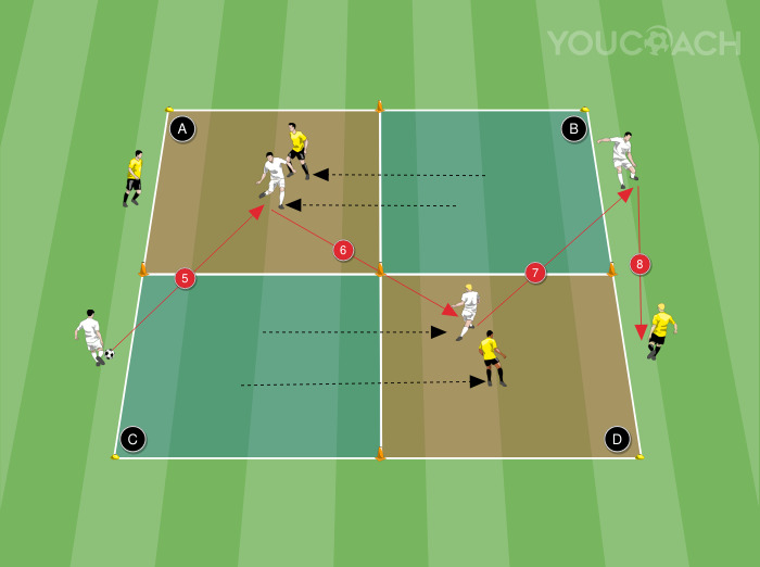 - I giocatori all'interno del quadrato devono muoversi per ricevere palla con movimenti di smarcamento contrari, ovvero in zona opposta rispetto alla posizione occupata dal proprio compagno di squadra, quindi in zone A-D oppure B-C