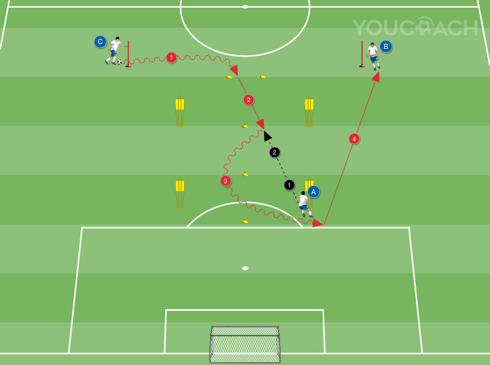 Proposta di esercitazione analitica di Marcelo Bielsa per allenare l'attaccante a smarcamenti efficaci |