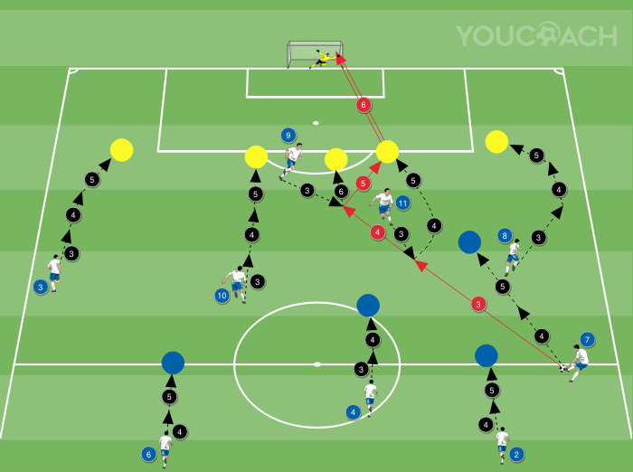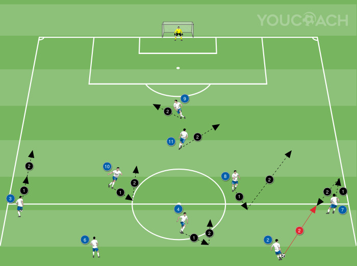 - Il giocatore 2 trasmette palla a 7 che si smarca incontro; 8 esegue un cambio di direzione scattando in corsa diagonale verso la fascia laterale destra per liberare spazio al centro. 4 e 10 effettuano un cambio di direzione alzandosi; 9 inizia un contromovimento allungando la difesa avversaria. 11 allunga in diagonale; 3 continua ad avanzare lungo la fascia laterale sinistra.