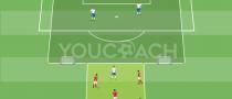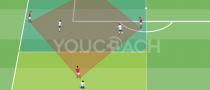 - Il giocatore, al quale è stata passata la palla, esegue un controllo orientato rispetto al cono centrale posizionato al centro del mini quadrato e riparte in conduzione palla per affrontare la sagoma successiva e così via