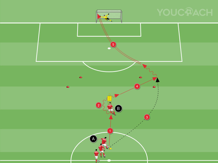 L'area nella quale si svolge l'esercitazione coincide con la zona adiacente all'area di rigore. Posizionare un paletto a circa 7-8 metri dall'area di rigore, in posizione centrale. Posizionare un cinesino a circa 10 metri dal paletto, centralmente (cinesino giallo in figura: posizione di partenza dell'attaccante). Creare con due coppie di cinesini due cancelli di larghezza 3 metri circa, uno a destra e uno a sinistra rispetto il paletto centrale. I due cancelli sono posizionati in linea diagonale tra il paletto centrale e i due vertici dell'area di rigore (come mostrato in figura). I giocatori partono dal cinesino (A), con la palla. Un giocatore (B) sosta in corrispondenza del paletto, spalle alla porta. I portieri si alternano a difesa della porta.