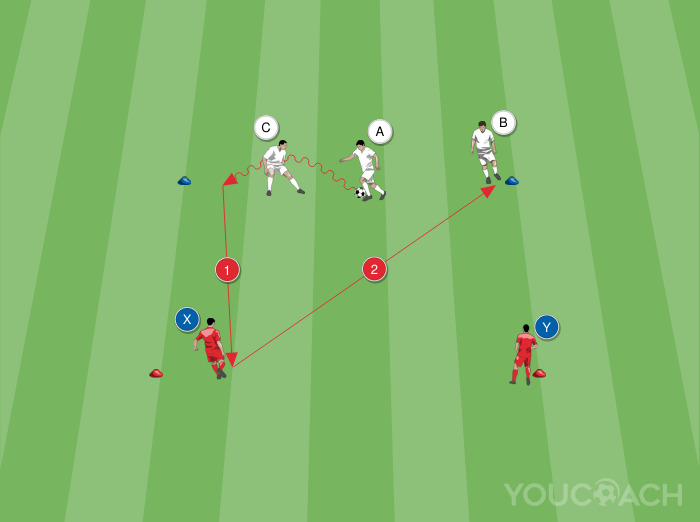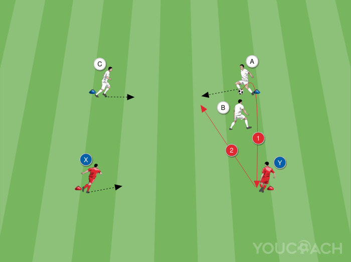Creare una linea retta di 15 metri utilizzando i due cinesini blu, a circa 8 o 10 metri di distanza comporre un'altra linea retta (della stessa lunghezza) parallela alla linea blu, utilizzando i due cinesini rossi (come in figura). Disporre i due giocatori di "sponda" (X e Y in casacca rossa) in corrispondenza dei cinesini rossi, altri due giocatori (A e C in tenuta bianca) di fianco ai cinesini blu e l'ultimo calciatore (B) a metà della linea retta blu, interno al campo tra le due coppie di cinesini. Consegnare il pallone al giocatore A.