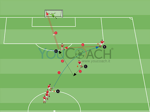 - Il giocatore in zona C, dovrà effettuare un movimento di avvicinamento al giocatore in zona A (movimento 1) per poi scattare verso l'area di rigore (movimento 2), ricevere il passaggio del compagno e finalizzare l'azione con il tiro in porta (tiro in porta 3)