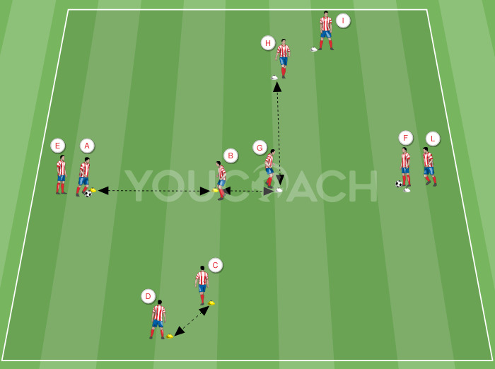 - Terminata la doppia azione di attacco e difesa di ogni squadra i dieci giocatori escono e lasciano spazio ad un nuovo gruppo che sviluppa un altro 5 contro 5, con i rossi che attaccano ed i bianchi che difendono