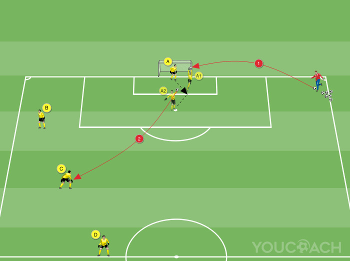 Creare un campo di gioco con i cinesini di 60x75 metri. Di fronte alla porta fissa, sul lato corto opposto del campo, posizionare una porta mobile (o formarla con due paletti). Formare due squadre da dieci componenti con l'utilizzo delle casacche. Cinque giocatori per squadra iniziano all'interno del campo, mentre gli altri compagni stazionano a fianco della propria porta in attesa del proprio turno di gioco. I portieri si collocano a difesa delle porte. Sistemare un buon numero di palloni nei pressi di entrambe le porte.