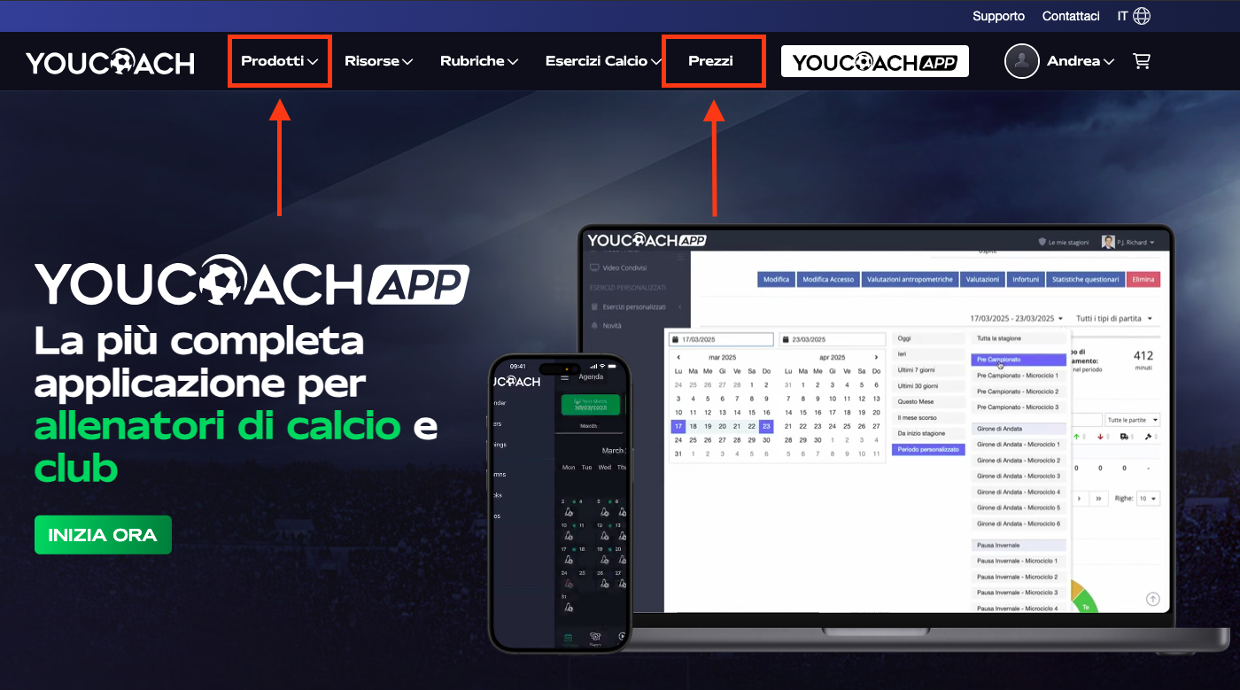 1 - Accedi al sito YouCoach.it e, dal menù principale, seleziona la sezione Prodotti → App oppure la pagina Prezzi