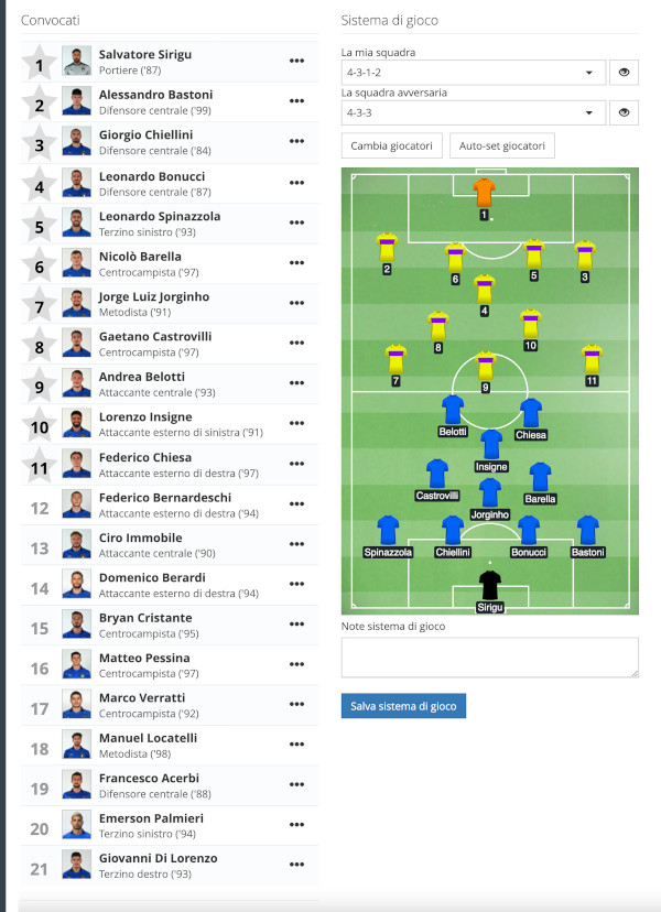 Attenzione: la modifica dei giocatori direttamente dal campetto grafico non permette il corretto salvataggio dei dati. Il grafico con i giocatori infatti non registra né aggiorna le statistiche, ma è solo un'interfaccia grafica che ti permette di personalizzare a livello "visivo" la disposizione dei giocatori in campo.