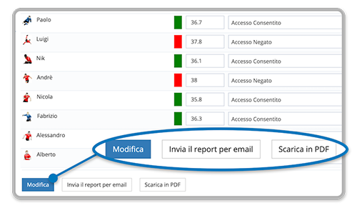 - cliccando sulla colonna temperatura in corrispondenza del nome di ogni giocatore per inserire la temperatura misurata: l’applicazione segnalerà automaticamente quale giocatore presenta una temperatura che supera il limite consentito;