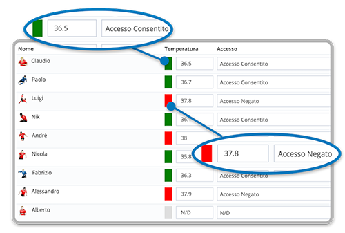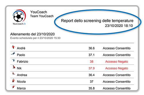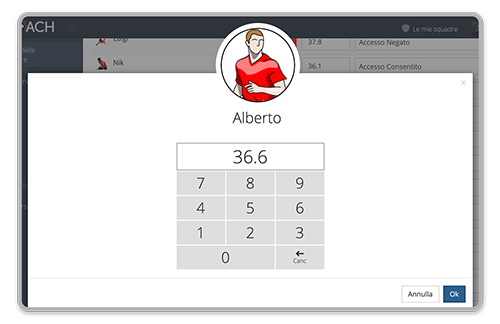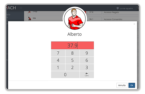 - cliccando sulla colonna temperatura in corrispondenza del nome di ogni giocatore per inserire la temperatura misurata: l’applicazione segnalerà automaticamente quale giocatore presenta una temperatura che supera il limite consentito;