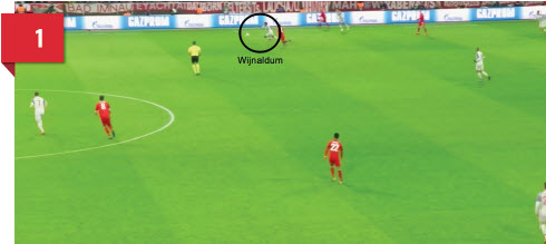 Cominciamo sottolineando l’attitudine degli attaccanti del Liverpool alla riaggressione, portando come esempio un’azione di Mané. Nell’esempio in figura Wijnaldum è in pieno possesso della palla e si sta dirigendo verso la porta avversaria (fig. 1). Dopo pochi istanti perde la palla a causa di un intervento avversario ma, contemporaneamente, Mané legge la situazione e si attiva per la riagressione (fig. 2), cominciando ad avvicinarsi al primo appoggio che vede vicino a sé. Nel momento stesso in cui il suo diretto avversario riceve la palla, Mané è già in contrasto e recupera il possesso (fig. 3).