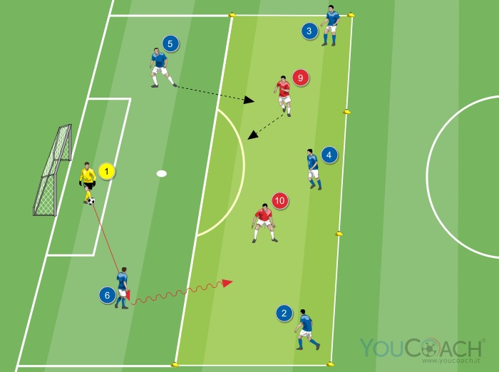 Di conseguenza, nello scegliere e condurre le esercitazioni, l’attenzione dell’allenatore non può non concentrarsi sull’orientamento del corpo, sul primo controllo, sulla capacità di guida, sulla capacità di lettura e di “vedere” la giocata più efficace in funzione della pressione avversaria. Non solo abilità tattiche individuali inoltre, ma anche collettive: per riuscire a creare una costruzione della manovra che diventa uno sviluppo efficace ed una conclusione pericolosa infatti, è necessario lavorare con esercitazioni appropriate sui collegamenti tra giocatori dello stesso reparto e di reparti diversi. Tutto questo lavoro tecnico-tattico diventa ancor più solido infine solo se sostenuto da grande fiducia e coraggio fra i giocatori. Di seguito proponiamo tre esercitazioni per la costruzione dal basso coinvolgendo il portiere tratte dalla nuova edizione dell'e-Book "Attaccare partendo dalle retrovie".