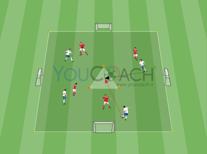 - Stimolare la fase di transizione: la squadra che difende, una volta recuperata palla, deve attaccare velocemente le quattro porte sui lati per fare gol. Gli avversari devono organizzarsi velocemente per evitare di subire la rete e farsi soprendere