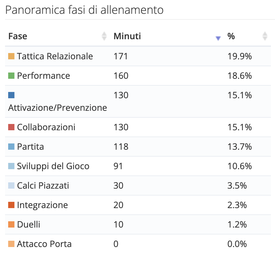 Il lavoro è costruito intorno a esercitazioni situazionalI, giochi semplificati, small-sided games, giochi di possesso, partite condizionate che riproducono contesti reali e richiedono costante collaborazione tra i giocatori. La stagione prevede molti momenti di lavoro in piccoli gruppi, non solo nelle fasi tecniche e tattiche, ma anche nel lavoro fisico e preventivo; i principi dei lavori in piccoli gruppi sono poi trasferiti nelle esercitazioni a numeriche maggiori.