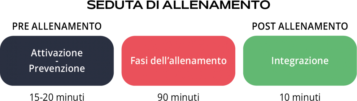 Ogni seduta è organizzata in tre fasi: pre-allenamento (15–20 minuti), allenamento centrale (90 minuti), post-allenamento (10 minuti)