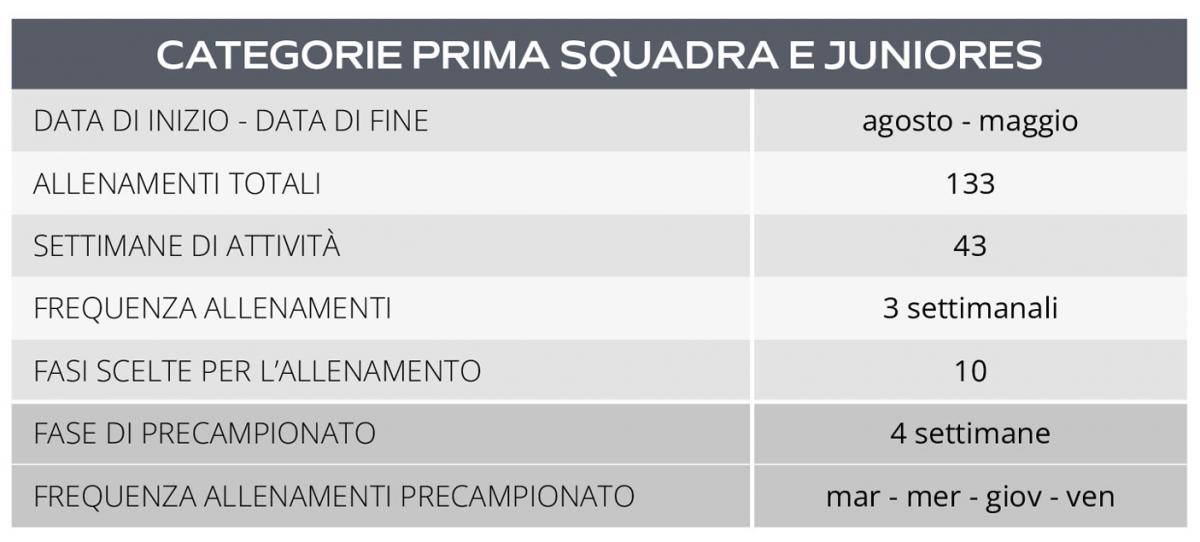 Per quanto riguarda la preparazione precampionato, è presente un blocco dedicato di 4 settimane. Questo macrociclo è progettato per accompagnare il rientro in campo dopo la sosta estiva; l’allenamento è quasi quotidiano e prevede un focus specifico su: