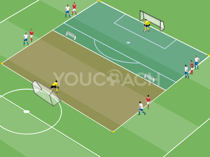 2 contro 2 - Vincere la superiorità numerica nel 2 contro 1 e nel 2 contro 2 più sponde laterali per la conclusione in porta, lavorando sulle transizioni -