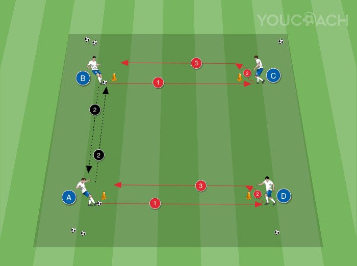 Trasmissione - Esercizio tecnico a 4 giocatori sulla trasmissione, ricezione e dominio palla con cambio di posizioni -