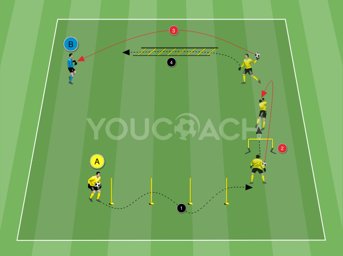 Tecnica del portiere - Esercizio analitico che allena vari gesti tecnici del portiere e una successiva situazione finale di 1 contro 1 -