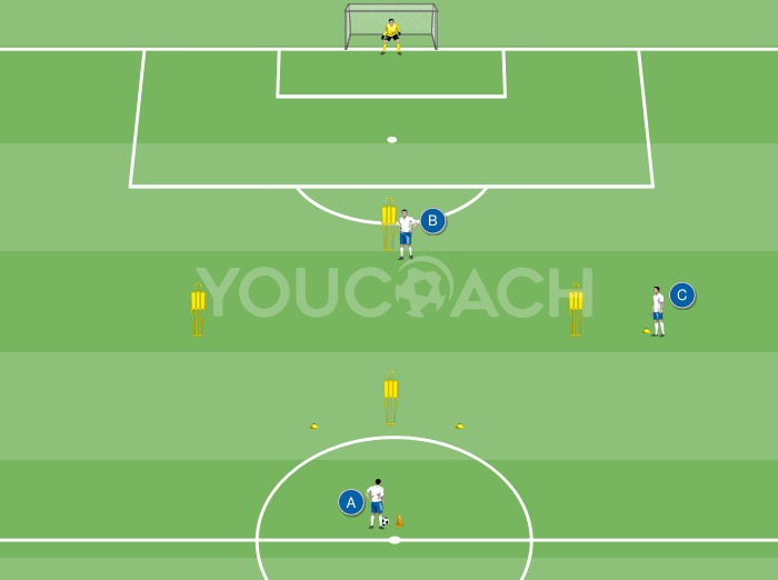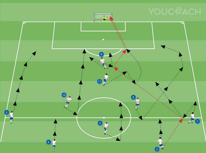 Conclusione - Combinazione di passaggi rasoterra con movimenti di smarcamento per conclusione in porta -