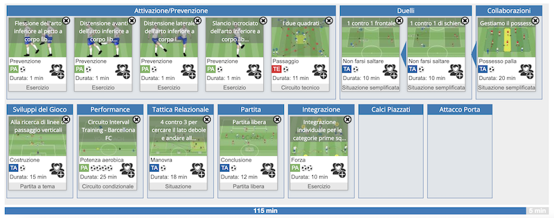 La programmazione annuale prevede 43 settimane di lavoro con tre sedute settimanali più partita, dalla fase iniziale della stagione fino al termine, per un totale di 133 sedute di allenamento complessive e 1107 esercitazioni diverse.