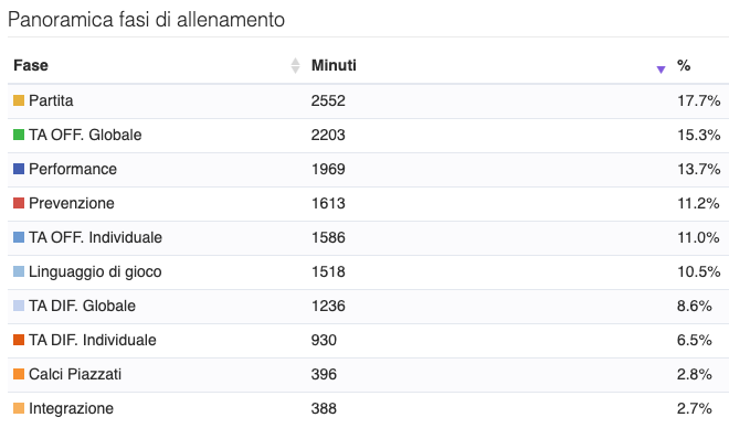 ​44 settimane di lavoro con tre sedute settimanali più partita, 132 sedute di allenamento complessive e 674 esercizi utilizzati