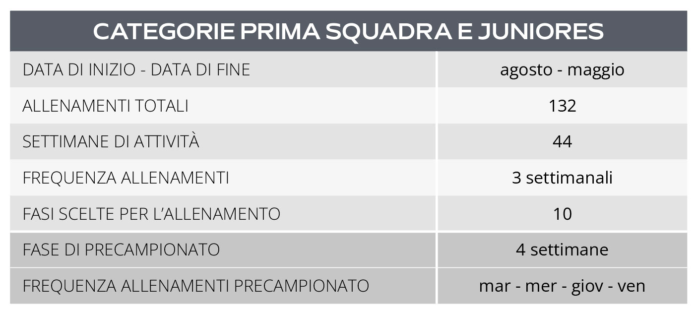 La programmazione annuale prevede 44 settimane di lavoro con tre sedute settimanali più partita, dalla fase iniziale della stagione fino al termine, per un totale di 132 sedute di allenamento complessive e 674 esercitazioni diverse.