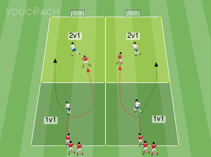 1 contro 1 - Esercitazione in situazione contemporanea di gioco 1 contro 1 e successivo 2 contro 1 con finalizzazione -