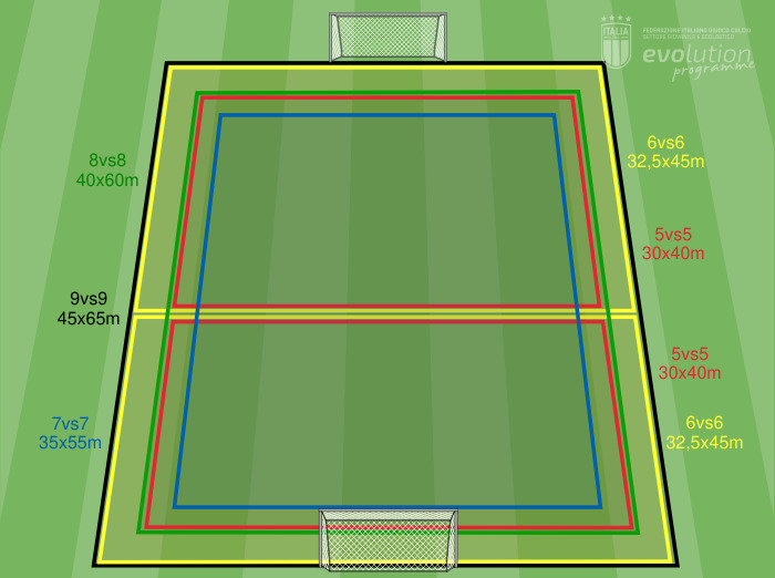 Le dimensioni del campo sono intese come ideali e vanno adattate alle disponibilità delle proprie strutture di allenamento.